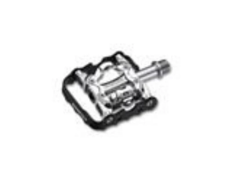 Silbernes Exustar Duo Klickpedal E-PM-86 für Mountainbike und Cityrad mit Alu-Käfig und Cro-MO-Achse bei einem Gewicht von 358 Gramm pro Paar.