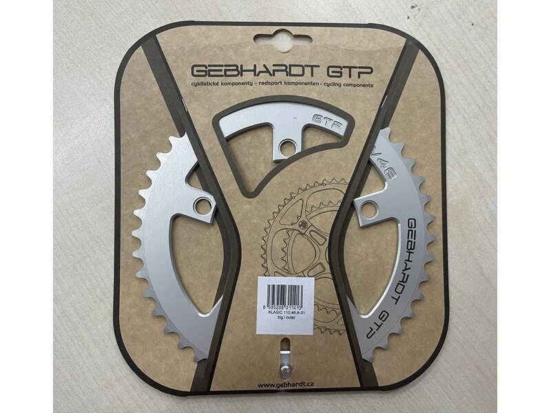 Kettenblatt von Gebhard in silber mit 46 Zähnen mit einem Lochkreis von 110 für alte Shimano 5-Arm Kurbeln.